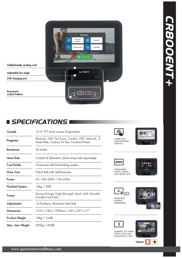 The CR800ENT+ incorporates touchscreen technology on a large 15.6” entertainment display. Users can screen mirror from their phone so they can watch whatever they want. Pre-loaded apps also give users the ability to stay entertained with popular streaming, news, and social media content. Connects to third party apps via Bluetooth FTMS. And if that isn’t enough, the facility can enable the ability to watch cable TV through an HDMI and cable box connection. The USB charging port, cooling fan, and user-intuitive design appeal to a wide range of users.